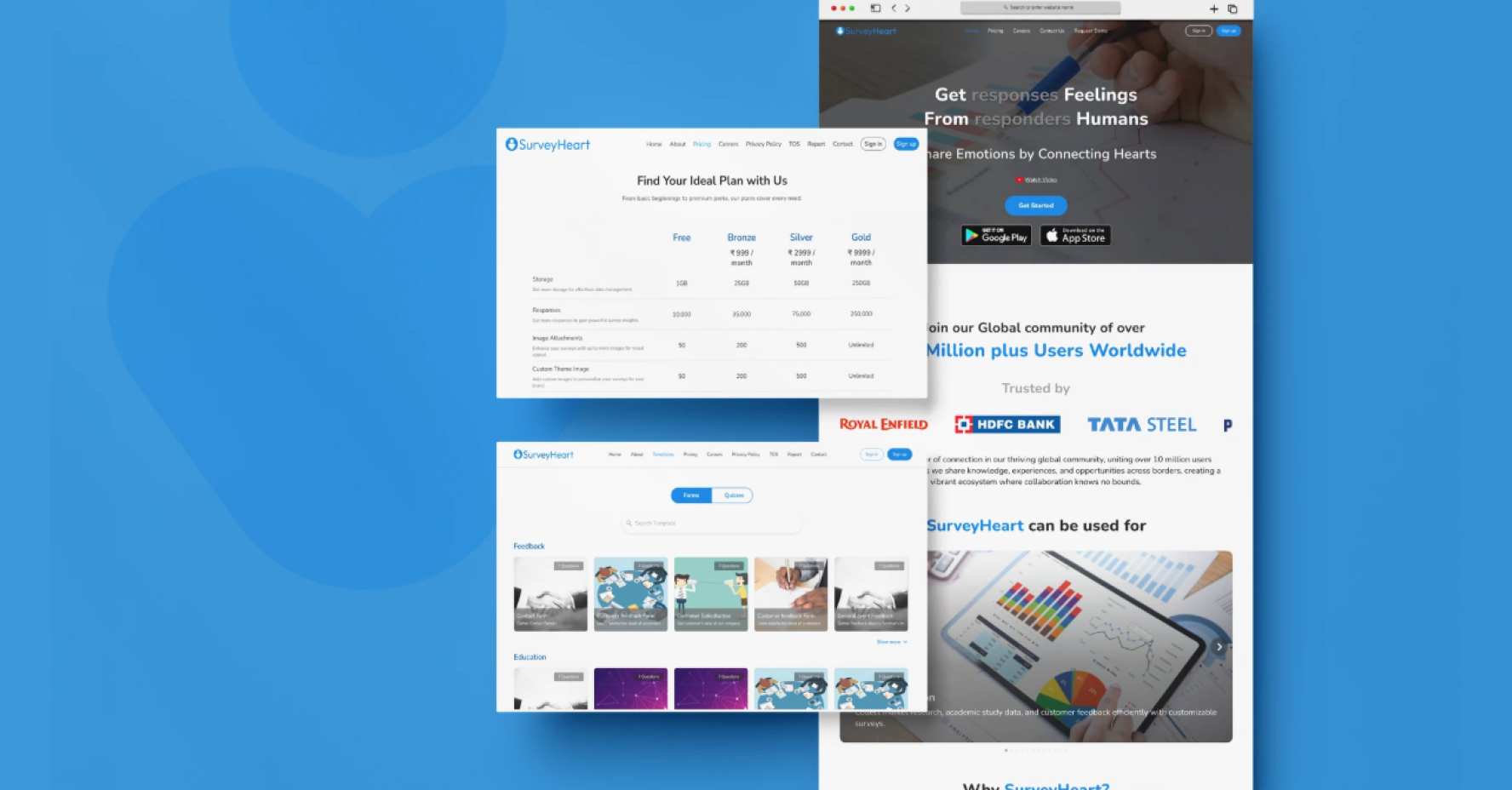 Balancing design cohesion while incorporating over 60 new features was a significant challenge, as each addition risked overwhelming the UI. Integrating B2C, B2B, and SaaS functionalities without deviating from core survey capabilities required constant adjustments. Developing a responsive webpage that stayed visually appealing amid feedback from diverse user groups, setting up a premium model without diminishing free value, and adapting onboarding to introduce premium features—all demanded careful refinement to keep SurveyHeart competitive.